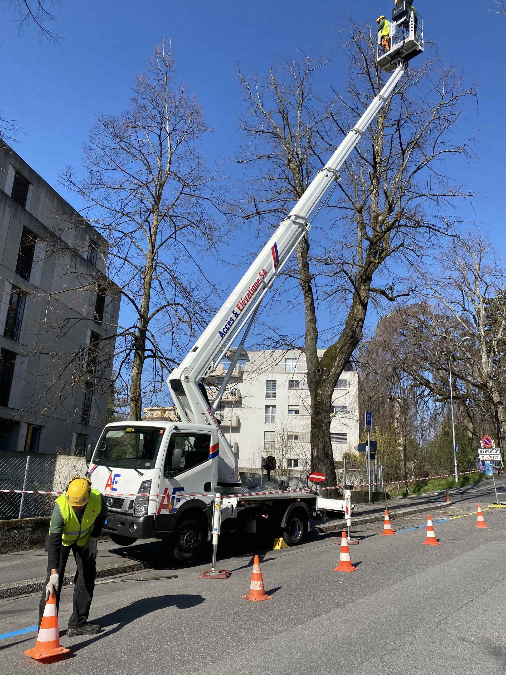 Nous sommes équipés pour effectuer l'élagage des arbres avec cordes et avec nacelle. Autrement dit, nous avons un équipement spécialisé et sécurisé pour grimper dans des arbres extrêmement hauts. Nous procédons généralement à l'élagage hivernal des arbres.
